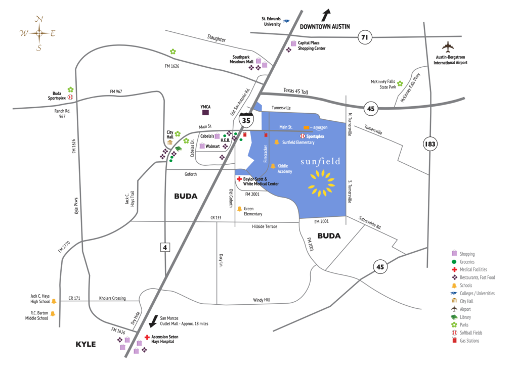 Sunfield’s Main Entrance is located off of FM 2001/White Wing. Exit FM 2001 and go east. The community will be located about a mile and a half up on your left!